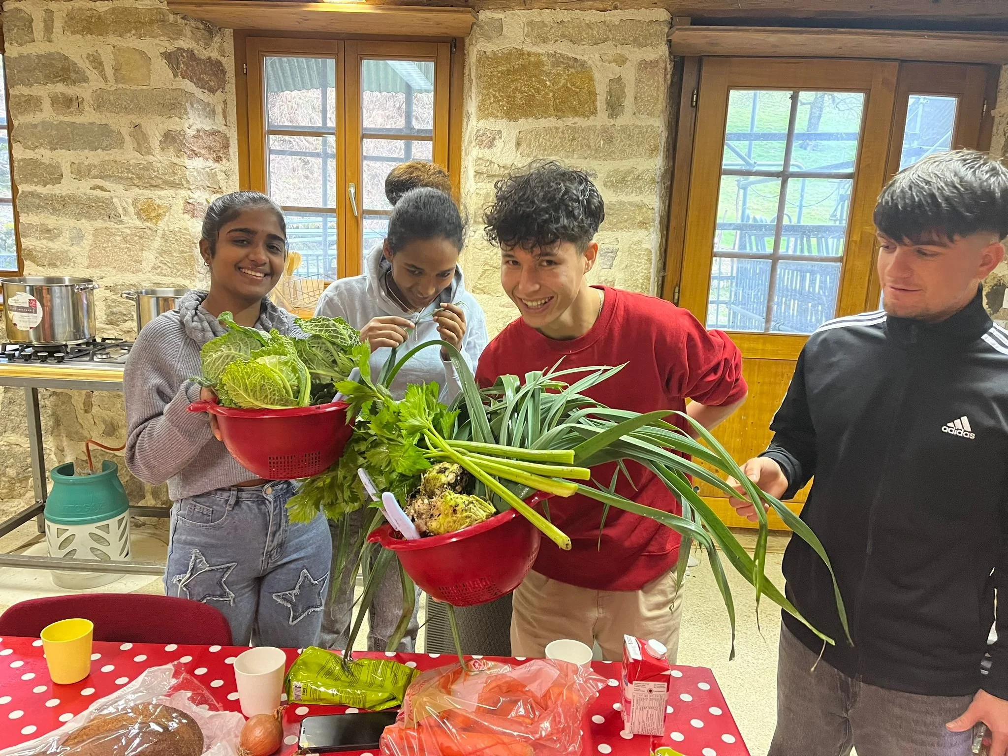 Im eigenen Gemüsegarten bauen die Schülerinnen und Schüler Gemüse an, pflegen die Pflanzen und ernten, was sie selbst gesät haben. Auch die Äpfel werden im Herbst geerntet und zu leckerem Most verarbeitet. Das frisch geerntete Gemüse wird direkt auf dem Hof zu gemeinsamen Mahlzeiten verarbeitet – eine Erfahrung, die den Wert von Lebensmitteln greifbar macht.